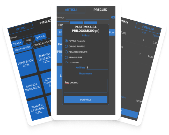 Minimizirajte vrijeme čekanja i optimizirajte tok rada u vašem restoranu uz pomoć naše aplikacije. Vaše osoblje lako može unijeti narudžbe direktno u sistem, koje se momentalno prenose šanku i kuhinji kako bi počela pripreme. U međuvremenu, vaše osoblje može nesmetano nastaviti prijem narudžbi od drugih gostiju, osiguravajući brzu i besprijekornu uslugu.