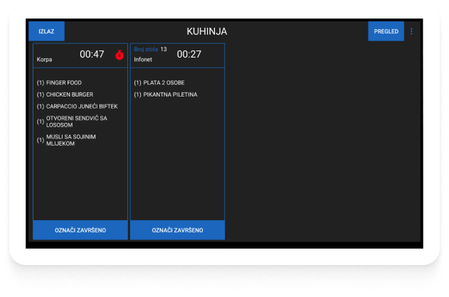 Poboljšajte efikasnost procesa u vašoj kuhinji i osnažite vaše osoblje s alatima koji im trebaju. Naš softver omogućava vam da efikasno upravljate kuhinjom koristeći funkcije tajmera i grupisanja narudžbi s istog stola. Ovo osigurava da vaši gosti imaju bolje iskustvo, primajući svoje obroke na vrijeme i na koordiniran način.