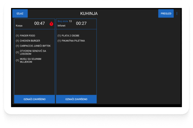 Poboljšajte efikasnost procesa u vašoj kuhinji i osnažite vaše osoblje s alatima koji im trebaju. Naš softver omogućava vam da efikasno upravljate kuhinjom koristeći funkcije tajmera i grupisanja narudžbi s istog stola. Ovo osigurava da vaši gosti imaju bolje iskustvo, primajući svoje obroke na vrijeme i na koordiniran način.